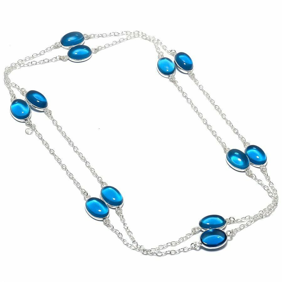 Ένα ξεχωριστό κολιέ, χειροποίητο ινδικό. Κατασκευασμένο από ασήμι 925, μήκους 92 εκατοστών. Διακοσμημένο με λαμπερά, διαυγή μπλε τοπάζια (Lab creation) σε κοπή oval! Total Carat Weight (TCW): 145 CTS.