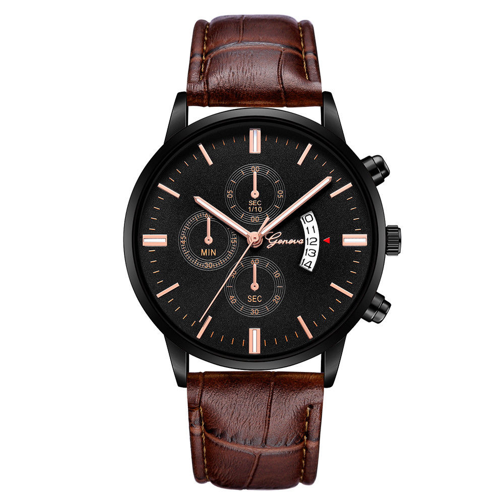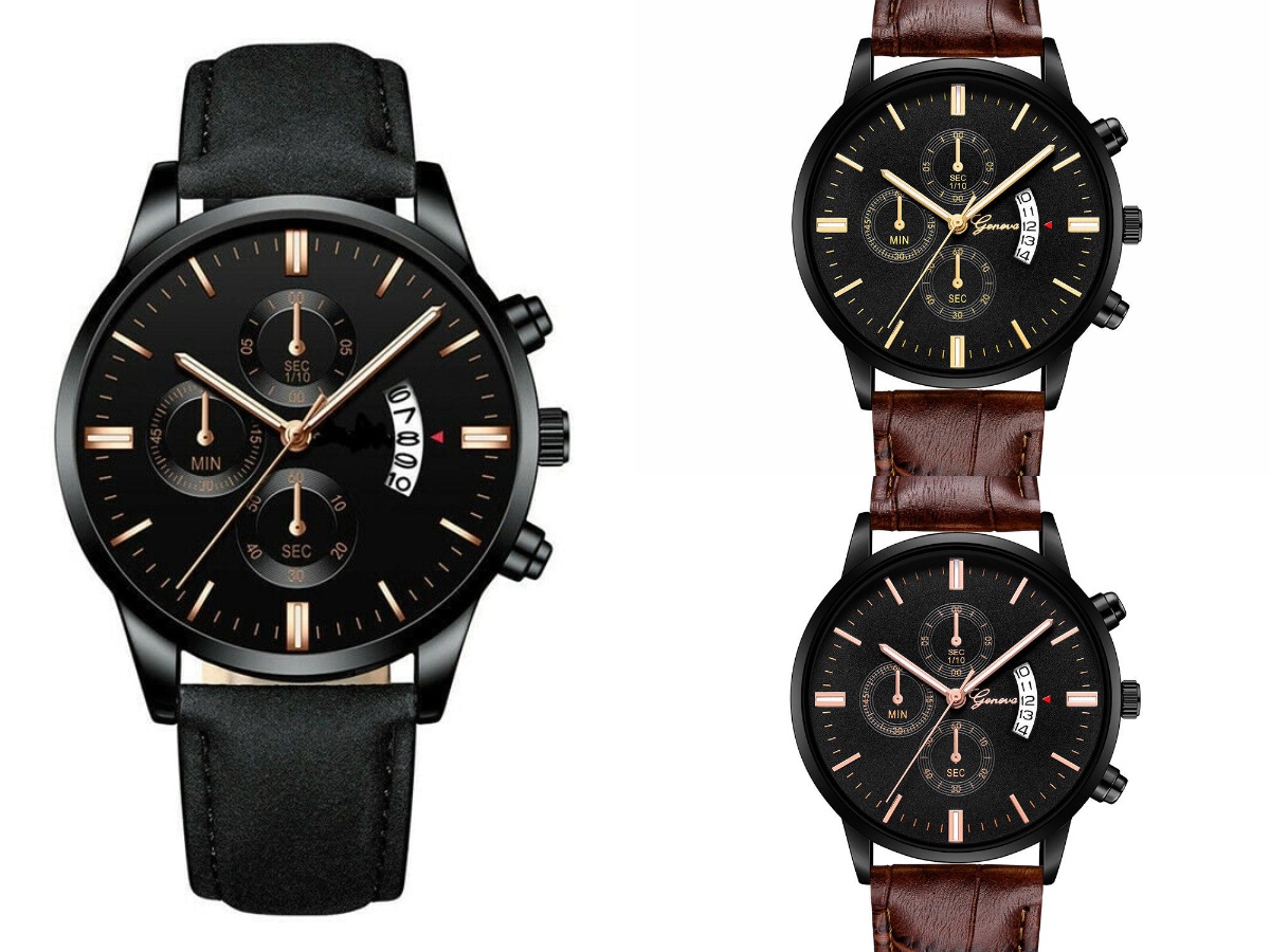 Ανδρικό, αναλογικό ρολόι GENEVA, με βελουτέ καφέ ή μαύρο λουράκι και μαύρο καντράν με rose-gold αποχρώσεις. Η κάσα του είναι από ανοξείδωτο ατσάλι. Διαθέτει ένδειξη ημερομηνίας. Το λουρί έχει μήκος 25 εκατοστά και η διάμετρος του καντράν είναι 4,5 εκατοστά. Αδιάβροχο μέχρι 3 Atm (πλύσιμο χεριών).