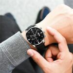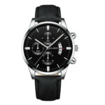 Ανδρικό, αναλογικό ρολόι GENEVA, με ιδιαίτερο βελουτέ λουράκι και μαύρο καντράν με ασημί αποχρώσεις. Η κάσα του είναι ασημί χρώματος από ανοξείδωτο ατσάλι. Διαθέτει ένδειξη ημερομηνίας. Το λουρί έχει μήκος 25 εκατοστά και η διάμετρος του καντράν είναι 4,5 εκατοστά.