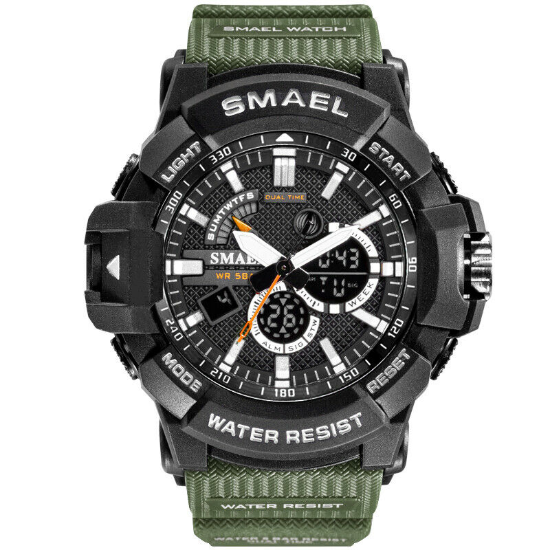 Ανδρικό, μοντέρνο και sportive ρολόι SMAEL κατασκευασμένο από ανθεκτικό πλαστικό και με army green πλαστικό λουράκι μήκους 26 εκατοστών! Διάμετρος καντράν 5,5 εκατοστά! Για σκληρές συνθήκες χρήσης. Διαθέτει ημερομηνία, εβδομάδα, ξυπνητήρι και άλλες λειτουργίες (φωτισμός κ.α.).