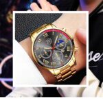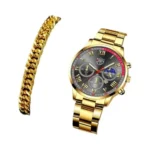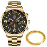 Ανδρικό SET, αποτελείται από ρολόι και βραχιόλι. Aναλογικό ρολόι, με χρυσό μπρασελέ από ανοξείδωτο ατσάλι και μαύρο καντράν με χρυσές αποχρώσεις και εσωτερικό design. Η κάσα του είναι χρυσού χρώματος από ανοξείδωτο ατσάλι. Διαθέτει ένδειξη ημερομηνίας. O μπρασελές του έχει μήκος 24 εκατοστά και η διάμετρος του καντράν είναι 4,2 εκατοστά. Αδιάβροχο μέχρι 3 Atm (πλύσιμο χεριών).