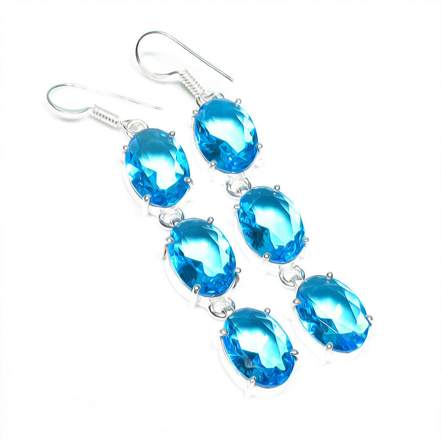Για εσάς που αγαπάτε το μπλε τοπάζι σας προτείνουμε, χειροποίητα, κρεμαστά σκουλαρίκια. Κατασκευασμένα από ασήμι 925, διακοσμημένα με μπλε , λαμπερό, μπλε τοπάζι. Τα σκουλαρίκια έχουν συνολικό μήκος 5 cm.