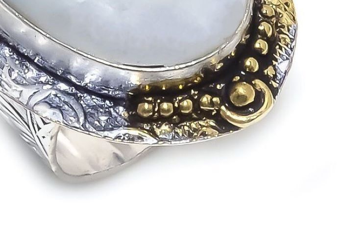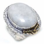 Σφυρήλατο, Χειροποίητο δαχτυλίδι, κατασκευασμένο από μασίφ ασήμι 925. Διακοσμημένο με υπέροχη, λευκή ορυκτή φεγγαρόπετρα. Το δαχτυλίδι διαθέτει φαρδιά γάμπα και χειροποίητο, περίτεχνο σχεδιασμό στη γάμπα του. Το καστόνι του διακοσμείται με επίχρυσα στοιχεία. Προτείνεται για τις κυρίες που αγαπούν τα πολύ μεγάλα δαχτυλίδια, διαστάσεων 4 χ 2,7 εκατοστά!