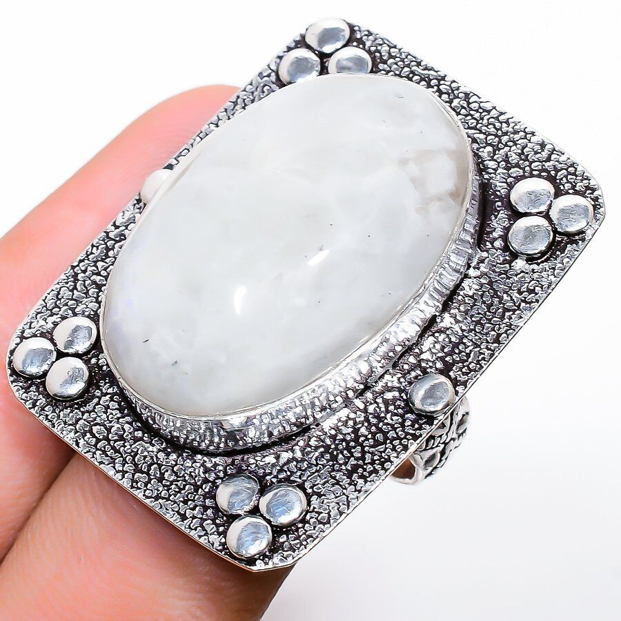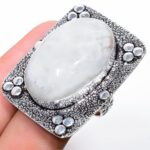 Σφυρήλατο, Χειροποίητο δαχτυλίδι, κατασκευασμένο από μασίφ ασήμι 925. Διακοσμημένο με υπέροχη, λευκή ορυκτή φεγγαρόπετρα. Το δαχτυλίδι διαθέτει χειροποίητο περίτεχνο σχεδιασμό στη γάμπα του. Προτείνεται για τις κυρίες που αγαπούν τα πολύ μεγάλα δαχτυλίδια, διαστάσεων 4 χ 3 εκατοστά!