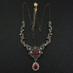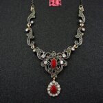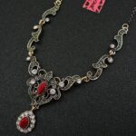 Πολύ ιδιαίτερο κόσμημα, κολιέ κατασκευασμένο από ασήμι και χαλκό με αντικέ επεξεργασία. Μεγάλο μοτίφ 16 x 5 εκατοστά.Συνοδεύεται από την ανάλογη αλυσίδα 45 εκατοστών 5 εκατοστά το αλυσιδάκι προέκτασης στο πίσω μέρος που καταλήγει σε μία καρδιά με το λογότυπο της γνωστής σχεδιάστριας Betsey Johnson. Διακοσμημένο με ζιργκόν σε κοπή round. Εντυπωσιάζουν με τη λάμψη τους και την καθαρότητα τους τα κόκκινα κρύσταλλα σε κοπή oval & pear.