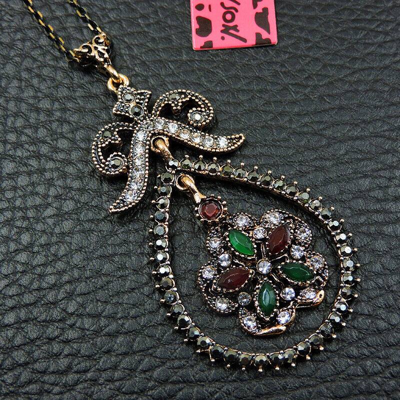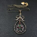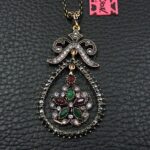 Πολύ ιδιαίτερο κόσμημα, κατασκευασμένο από ασήμι και χαλκό με αντικέ επεξεργασία. Μεγάλο μοτίφ 6×3 εκατοστά.Συνοδεύεται από την ανάλογη αλυσίδα 45 εκατοστών 5 εκατοστά το αλυσιδάκι προέκτασης στο πίσω μέρος που καταλήγει σε μία καρδιά με το λογότυπο της γνωστής σχεδιάστριας Betsey Johnson. Διακοσμημένο με ζιργκόν σε κοπή round. Εντυπωσιάζουν με τη λάμψη τους και την καθαρότητα τους τα κόκκινα και πράσινα κρύσταλλα σε κοπή οβάλ.