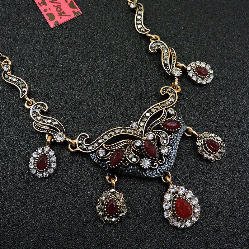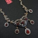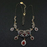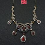 Πολύ ιδιαίτερο κόσμημα, κατασκευασμένο από ασήμι και χαλκό με αντικέ επεξεργασία. Μεγάλο μοτίφ 13 x 4,5 εκατοστά. Συνοδεύεται από την ανάλογη αλυσίδα 45 εκατοστών 5 εκατοστά το αλυσιδάκι προέκτασης στο πίσω μέρος που καταλήγει σε μία καρδιά με το λογότυπο της γνωστής σχεδιάστριας Betsey Johnson. Διακοσμημένο με ζιργκόν σε κοπή round. Εντυπωσιάζουν με τη λάμψη τους και την καθαρότητα τους τα κόκκινα κρύσταλλα σε κοπή pear.