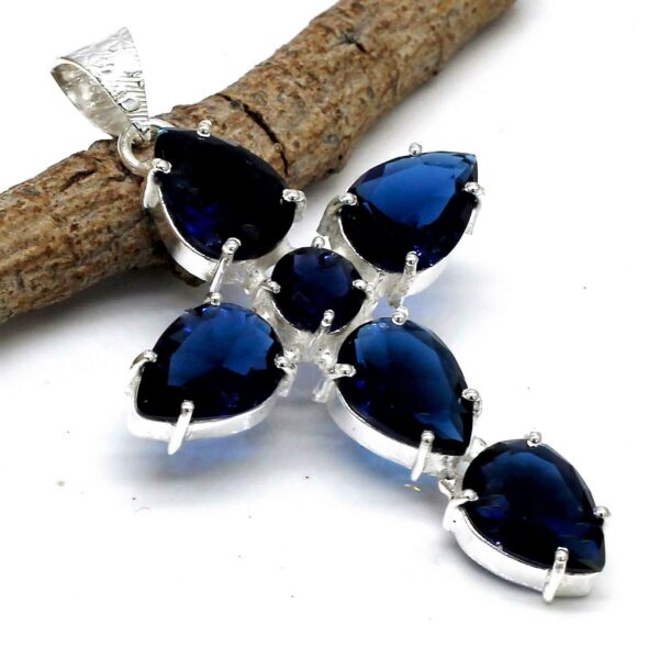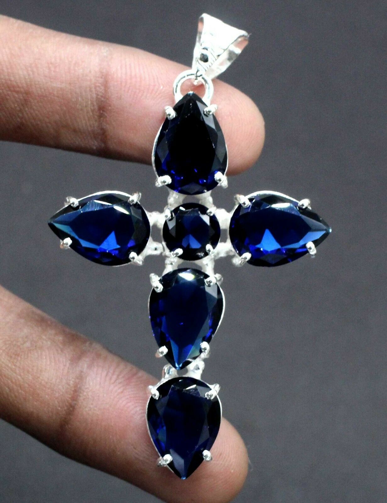 Iνδικός, χειροποίητος γυναικείος σταυρός, κατασκευασμένος από μασίφ ασήμι 925. Διακοσμημένος με υπέροχες, λαμπερές πέτρες μπλε τοπάζ ( Blue Topaz) (Lab creation) διαστάσεων 5,5 χ 3,5 εκατοστά.
