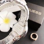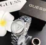 Γυναικείο αναλογικό ρολόι GUESS, απαράμιλλης ομορφιάς σε χρώμα silver! Το καντράν του περιμετρικά είναι διακοσμημένο με λευκά ζιργκόν σε κοπή round! Διάμετρος καντράν 3,7 εκατοστά! Διαθέτει μεταλλικό  μπρασελέ από ανοξείδωτο ατσάλι, ρυθμιζόμενο ώστε να προσαρμόζεται σε όλους τους καρπούς. Κρύσταλλο ορυκτό ειδικής σκλήρυνσης