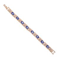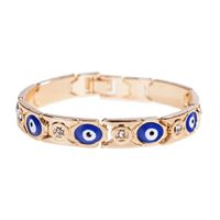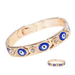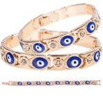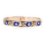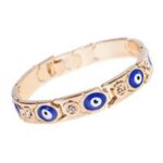 Γυναικείο μοντέρνο βραχιόλι για το κακό το μάτι. Κατασκευασμένο από ατσάλι με επιμετάλλωση κίτρινου χρυσού 14 καράτια. Διακοσμημένο με σφυρήλατα στελέχη και καστόνια με χρωματιστά, διαδοχικά τοποθετημένα εννέα (9) μπλε ζωγραφιστά κρύσταλλα ¨ματάκια¨ (τύπου vitraux) και δέκα (10) λευκά ζιργκόν σε κοπή round. Μήκος βραχιολιού 19 εκατοστά.