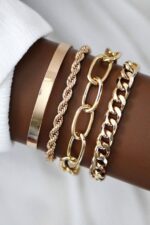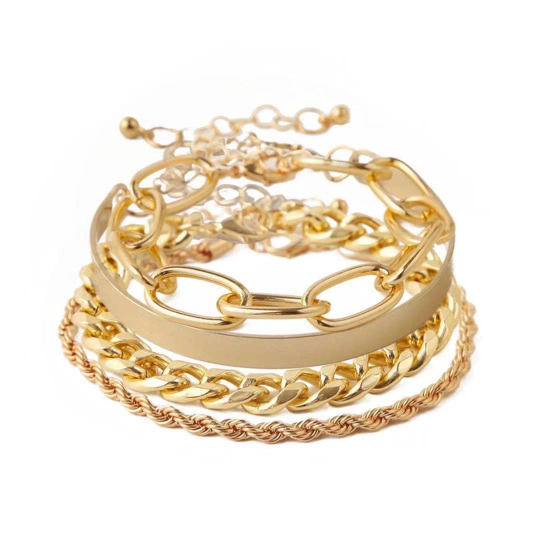 Γυναικείο μοντέρνο σετ που αποτελείται από 4 βραχιόλια! Χρυσές γυναικείες χειροπέδες από ορείχαλκο οι οποίες αυξομειώνονται και εφαρμόζουν ιδανικά σε κάθε γυναικείο καρπό με διπλή επιμετάλλωση κίτρινου χρυσού. Τα 4 βραχιόλια είναι open size. Έρχεται σε σας σε πολυτελή συσκευασία δώρου