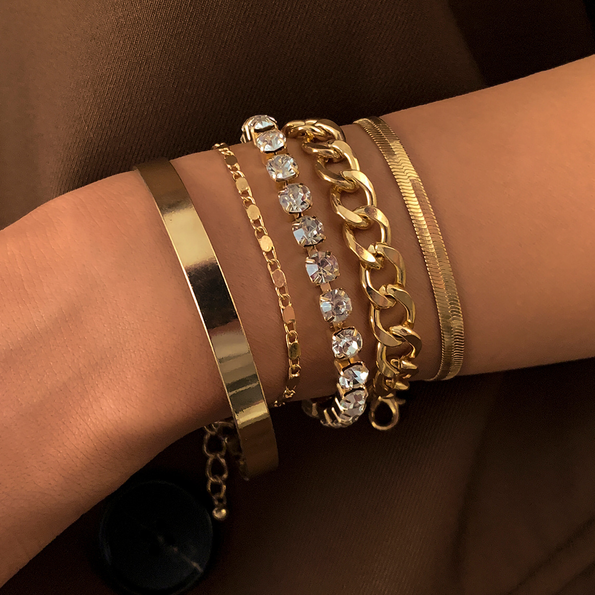 Ένα εντυπωσιακό  σετ σύνολο 5 κομψών βραχιολιών σίγουρα θα φωτίσει οποιονδήποτε από τους συνδυασμούς μόδας. Τα βραχιόλια είναι κατασκευασμένα από χρυσό ατσάλι με διπλή επιμετάλλωση χρυσού. Τα βραχιόλια διαθέτουν και αλυσιδάκι προέκτασης.