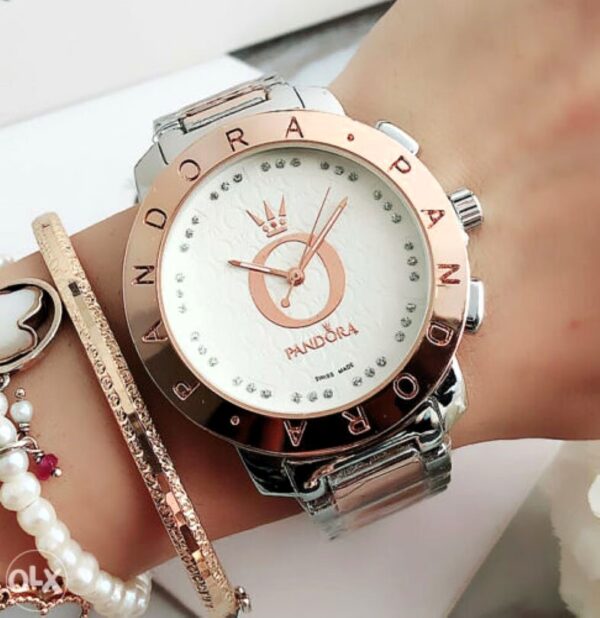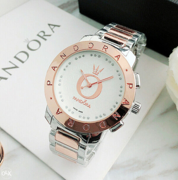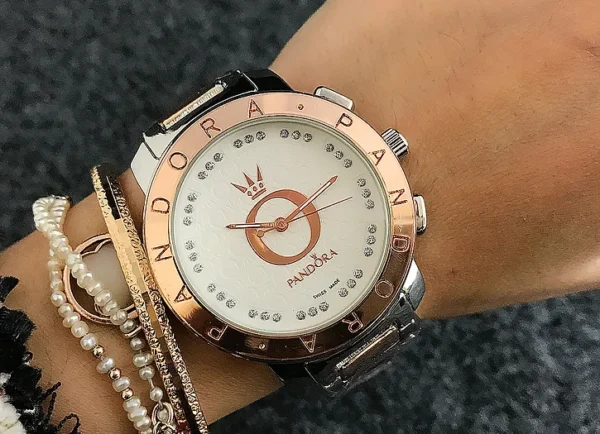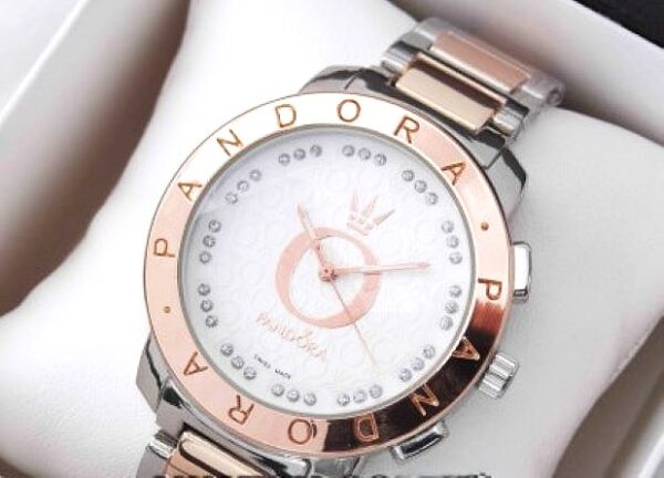 Γυναικείο ρολόι PANDORA Luxury, σε χρώμα rose-gold σε μπρασελέ και καντράν. Kατασκευασμένο εξ ολοκλήρου από ανοξείδωτο ατσάλι υψηλής αντοχής και ποιότητας για καθημερινή χρήση. Διαθέτει ενισχυμένο αντιθαμβωτικό, ορυκτό τζάμι στο καντράν του! Διακοσμημένο εσωτερικά με ταπετσαρία από αλάβαστρο και λευκά ζιργκόν σε κοπή round. Αντιαλλεργικό, σύμφωνα με τις απαιτήσεις της Ευρωπαϊκής Ένωσης! Διάμετρος καντράν 4,2 εκατοστά!!