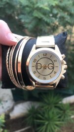 Γυναικείο σετ ρολόι & 5 βραχιόλια, σε χρώμα gold σε μπρασελέ και καντράν, με την κάσα του κατασκευασμένη από ανοξείδωτο ατσάλι, αδιάβροχο μέχρι 3 Atm (πλύσιμο χεριών)! Tα 5 βραχιόλια είναι επίσης κατασκευασμένα από ανοξείδωτο ατσάλι.