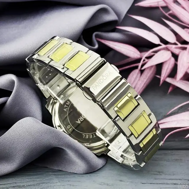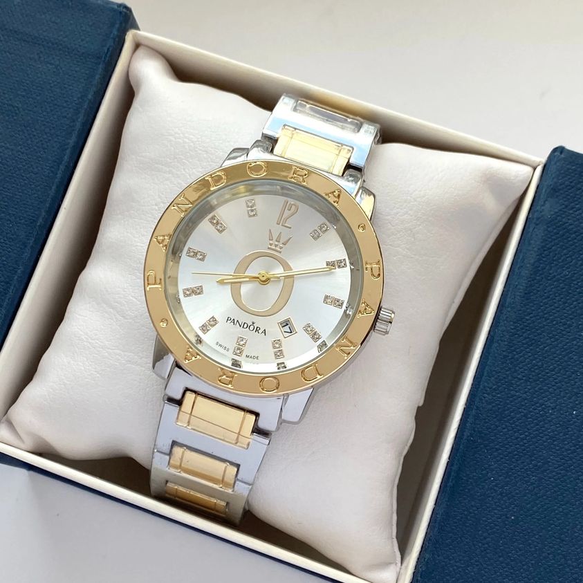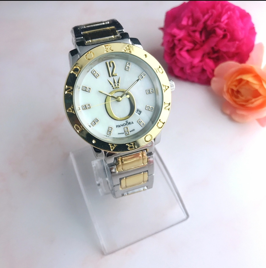 Γυναικείο ρολόι πολυτελείας PANDORA, αναλογικό, πολύ μοντέρνο, σε silver – gold χρώμα σε μπρασελέ και καντράν από ανοξείδωτο ατσάλι υψηλής αντοχής και ποιότητας για καθημερινή χρήση και με ενισχυμένο αντιθαμβωτικό τζάμι στο καντράν του! Αντιαλλεργικό, σύμφωνα με τις απαιτήσεις της Ευρωπαϊκής Ένωσης! Διαθέτει και ένδειξη ημερομηνίας! Διακοσμημένο εσωτερικά με λευκά αυστραλιανά κρύσταλλα!