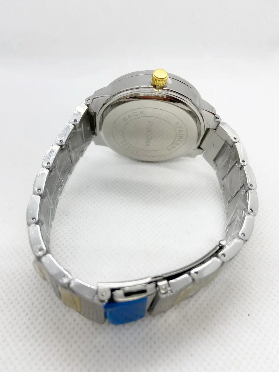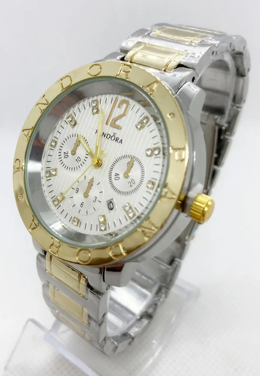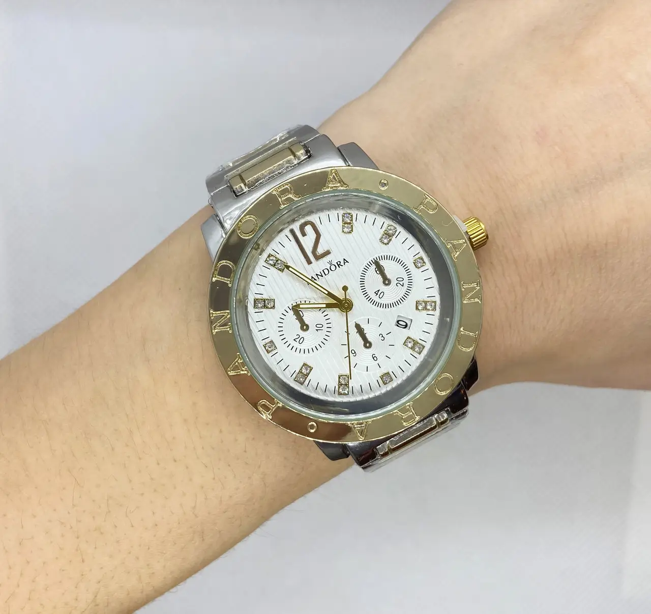 Γυναικείο ρολόι πολυτελείας PANDORA, αναλογικό, πολύ μοντέρνο, σε silver – gold χρώμα σε μπρασελέ και καντράν από ανοξείδωτο ατσάλι υψηλής αντοχής και ποιότητας για καθημερινή χρήση και με ενισχυμένο αντιθαμβωτικό τζάμι στο καντράν του! Αντιαλλεργικό, σύμφωνα με τις απαιτήσεις της Ευρωπαϊκής Ένωσης! Διακοσμημένο εσωτερικά με λευκά αυστραλιανά κρύσταλλα!