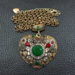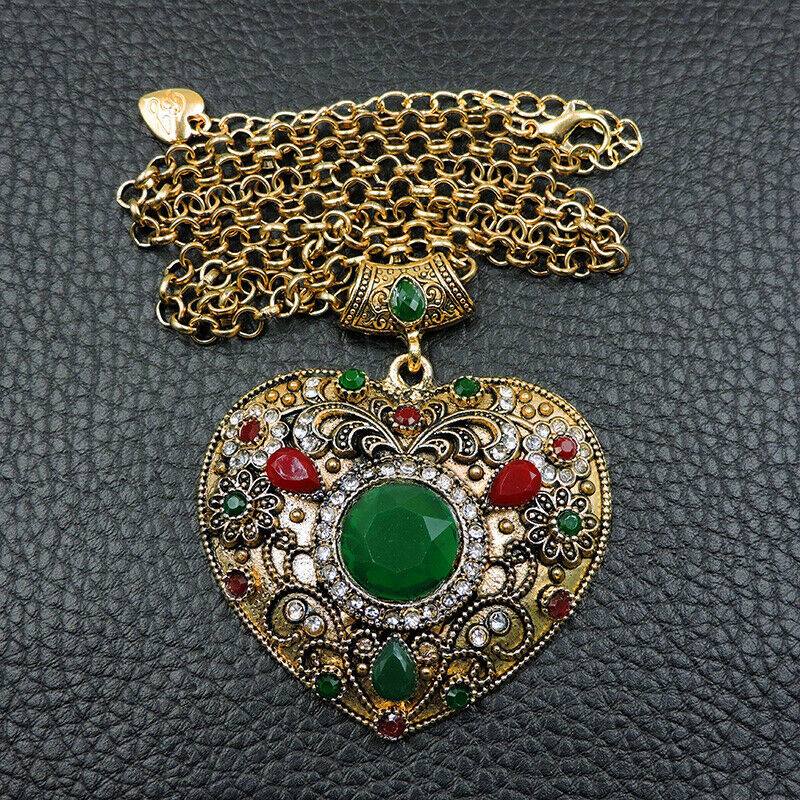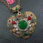 Ιδιαίτερο χειροποίητο κολιέ κατασκευασμένο από ασήμι και χαλκό με αντικέ επεξεργασία. Μεγάλο μοτίφ 6cm x 5cm,σε σχήμα καρδιάς το οποίο συνοδεύεται από την ανάλογη αλυσίδα 70 εκατοστών 5 εκατοστά το αλυσιδάκι προέκτασης στο πίσω μέρος, που καταλήγει σε μία καρδιά με το λογότυπο της σχεδιάστριας Betsey Johnson. Διακοσμημένο με πέτρες κόκκινες & πράσινες.
