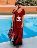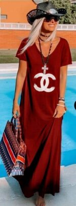 Καλοκαιρινό κόκκινο μακρύ φόρεμα με τύπωμα CC !! Για να είστε πάντα στη μόδα! Είναι κατασκευασμένο από 80% βαμβάκι και 20% βισκόζη.