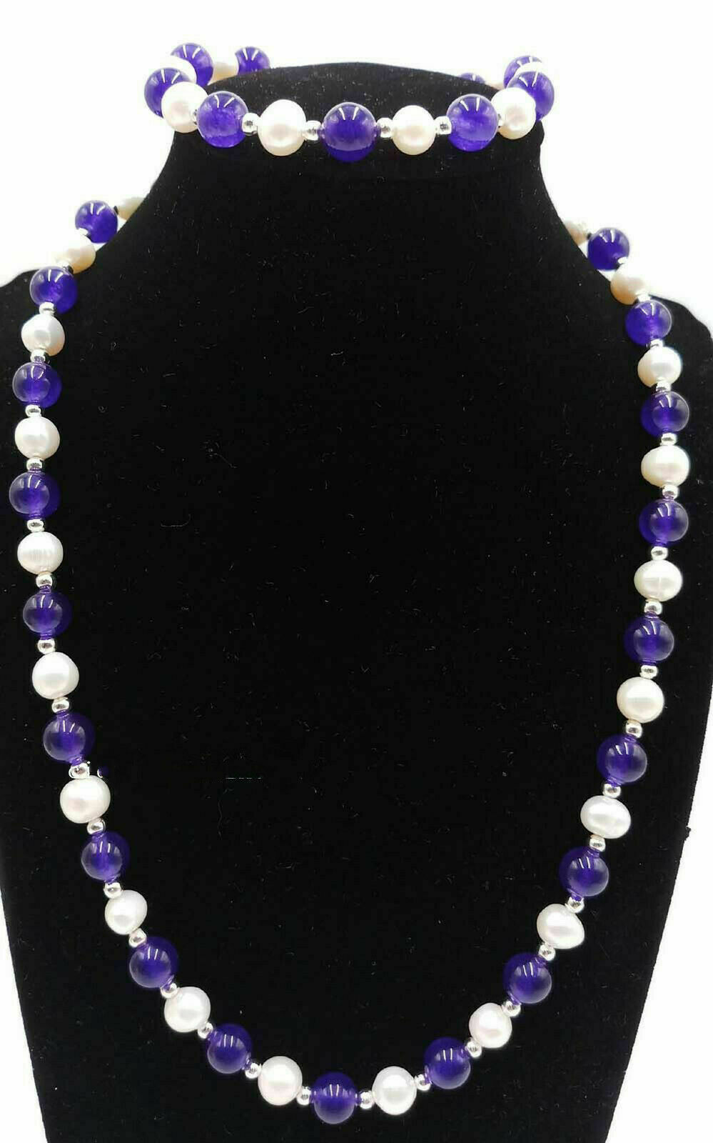 Καλοκαιρινό σετ κολιέ μαζί με βραχιόλι, διακοσμημένο με λευκά μαργαριτάρια γλυκού νερού Ιαπωνίας 7- 8 χιλιοστών και φυσικούς Sage Αμέθυστους 9 χιλιοστών. Το κολιέ έχει μήκος 46 εκατοστά.