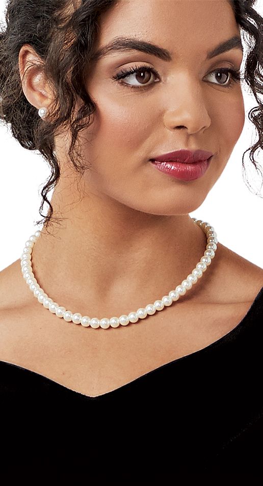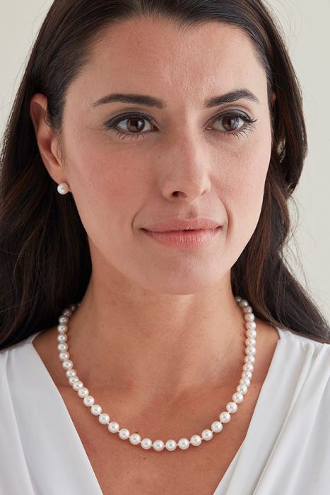 Σετ Χειροποίητο που αποτελείται από κολιέ  και καρφωτά σκουλαρίκια. Κατασκευασμένο από Shell πέρλες μεγέθους 8 χιλιοστών, περασμένες  σε διπλό μεταξωτό νήμα. Μήκος κολιέ 47 εκατοστά, σε χρώμα κατάλευκο και λαμπερό, με τα ακριβώς ίδια σκουλαρίκια του!! Τα μεταλλικά στοιχεία του είναι από ασήμι 925. Ένα διαχρονικό κόσμημα για κάθε περίσταση που θα απογειώσει την εμφάνισή σας.