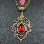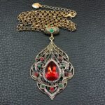Πολύ ιδιαίτερο κόσμημα, κατασκευασμένο από ασήμι και χαλκό με αντικέ επεξεργασία. Μεγάλο μοτίφ 8,5×5 εκατοστά.Συνοδεύεται από την ανάλογη αλυσίδα μήκους 70 εκατοστών 5 εκατοστά το αλυσιδάκι προέκτασης στο πίσω μέρος που καταλήγει σε μία καρδιά με το λογότυπο της σχεδιάστριας την Betsey Johnson. Διακοσμημένο με ζιργκόν σε κοπή round. Εντυπωσιάζει με τη λάμψη του και την καθαρότητα του το κεντρικό κόκκινο κρύσταλλο σε κοπή pear.