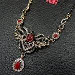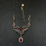 Πολύ ιδιαίτερο κόσμημα, κολιέ κατασκευασμένο από ασήμι και χαλκό με αντικέ επεξεργασία. Μεγάλο μοτίφ 14,5 x 5,5 εκατοστά. Συνοδεύεται από την ανάλογη αλυσίδα 45 εκατοστών 5 εκατοστά το αλυσιδάκι προέκτασης στο πίσω μέρος που καταλήγει σε μία καρδιά με το λογότυπο της γνωστής σχεδιάστριας Betsey Johnson. Διακοσμημένο με ζιργκόν σε κοπή round. Εντυπωσιάζουν με τη λάμψη τους και την καθαρότητα τους τα κόκκινα κρύσταλλα σε κοπή oval & pear.