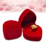 Βελούδινο κουτί για δαχτυλίδι, σκουλαρίκια ή μενταγιόν, σε σχήμα καρδιάς. Η κορυφή είναι εμφανής. Μέσα στο κουτί υπάρχει μια θήκη κοσμημάτων.