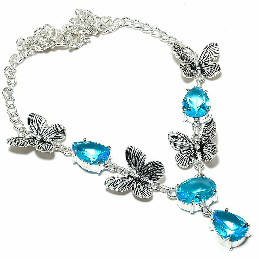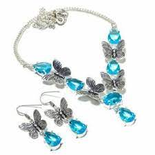 Για εντυπωσιακές και λαμπερές εμφανίσεις σας προτείνουμε σετ χειροποίητο, σκουλαρίκια μαζί με κολιέ ασημένιο 925. Διακοσμημένο με Σουηδικά μπλε τοπάζια (Lab creation) σε κοπή pear και oval. Μήκος κολιέ 47 cm. Σχέδιο πεταλούδα.