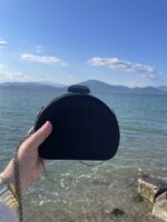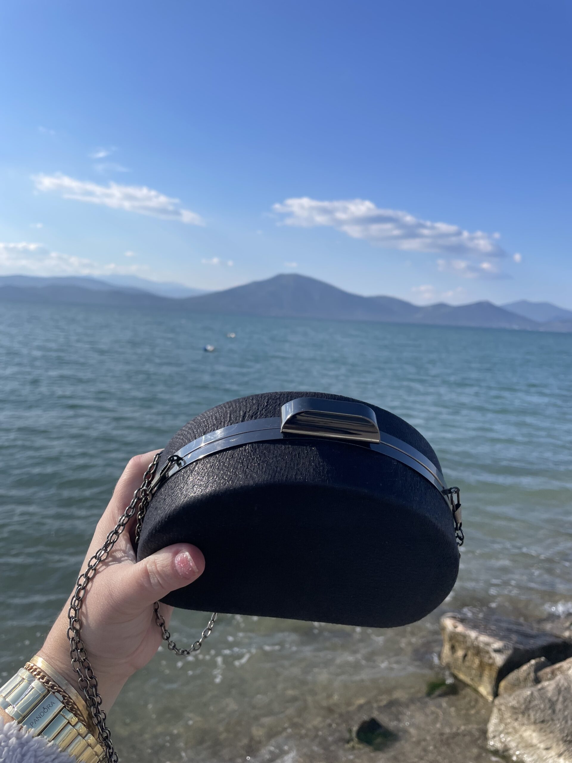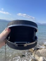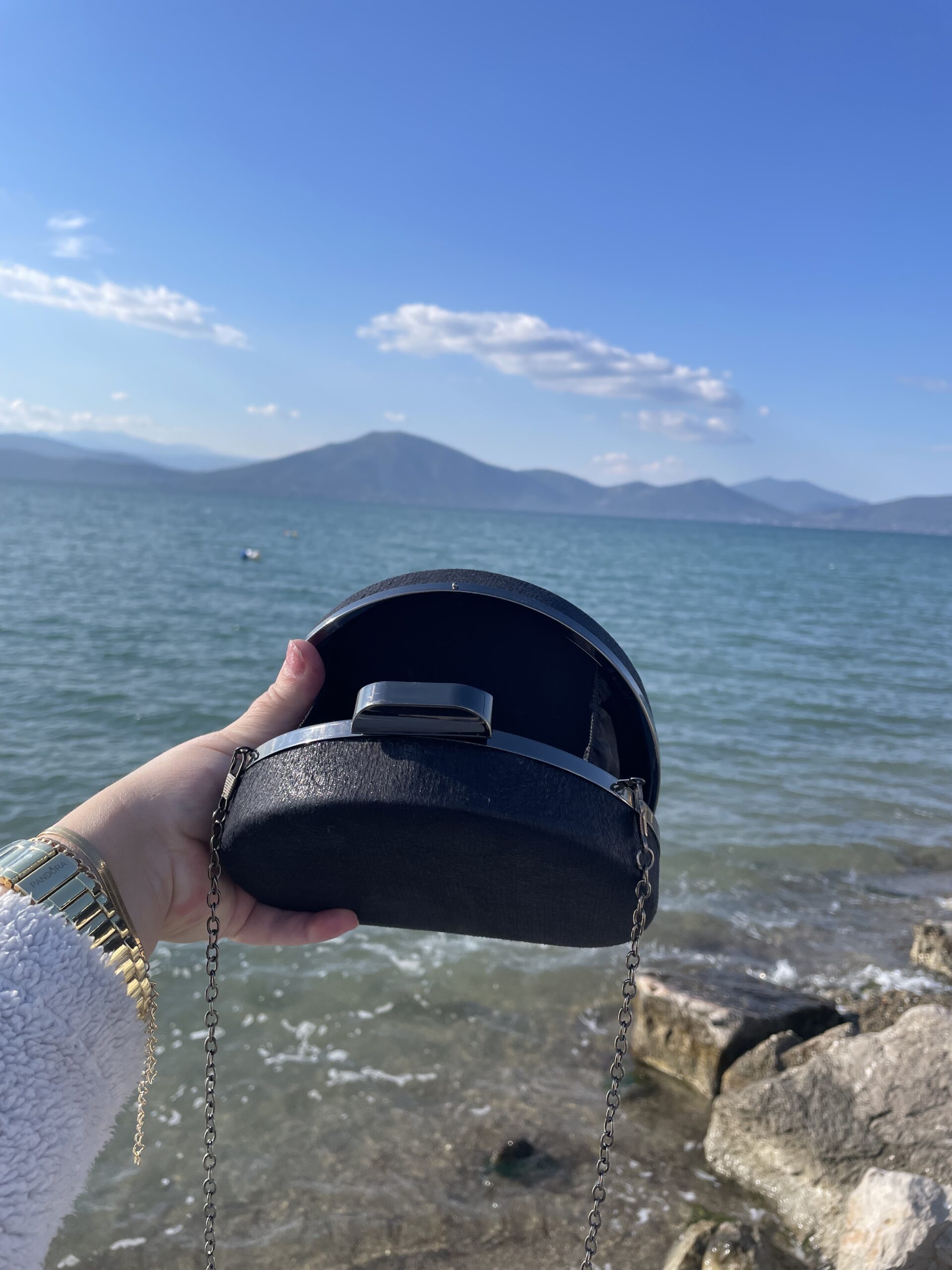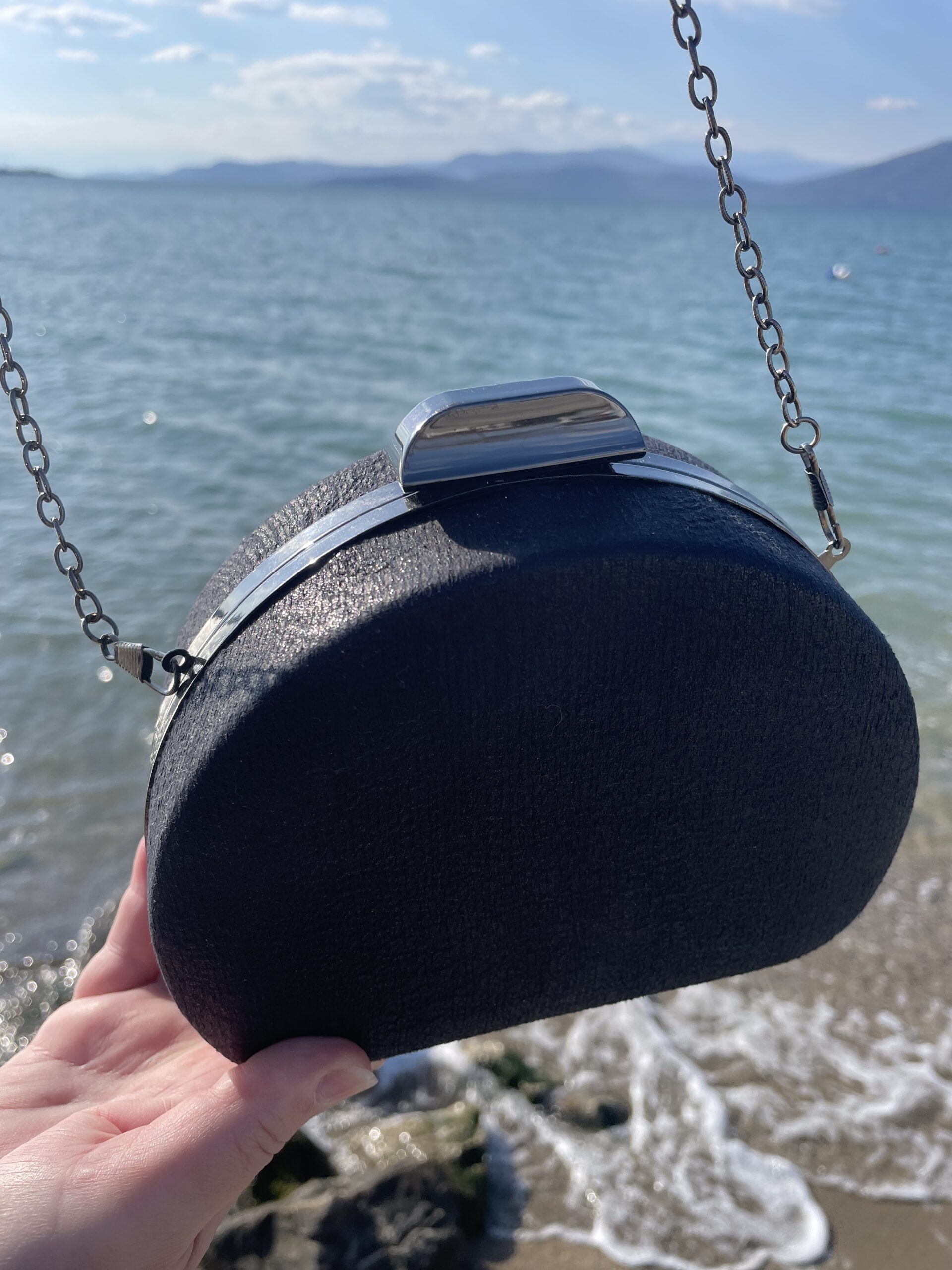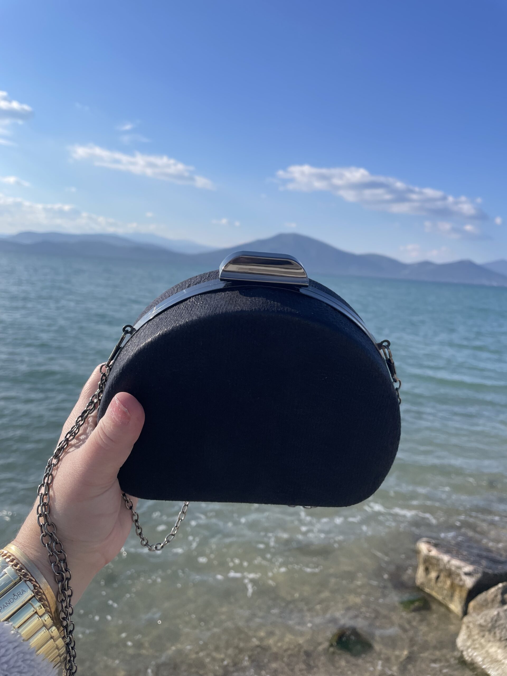 Κομψό τσαντάκι σε vintage γραμμή σε μεσαίο μέγεθος με μεταλλικό κούμπωμα και άνετο αποθηκευτικό χώρο. Μπορεί να φορεθεί χιαστί καθώς διαθέτει μακρύ μαύρο μεταλλικό αποσπώμενο λουράκι. Η τσάντα είναι κατασκευασμένη από σκληρό υλικό εσωτερικά και επενδυμένη με πολυτελές μαύρο ύφασμα εξωτερικά ✓ Διαστάσεις : 20 cm