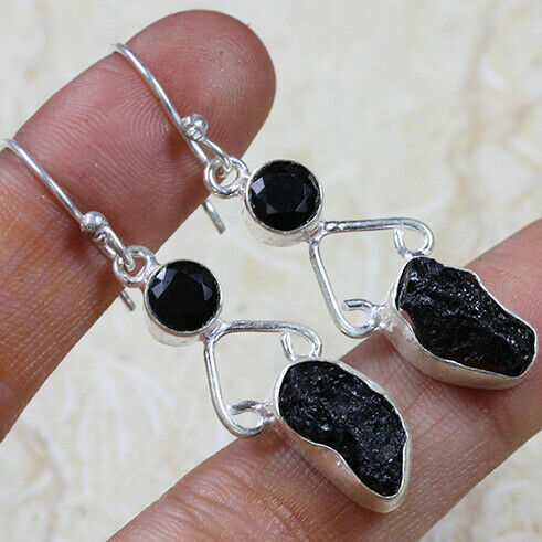 Χειροποίητα ινδικά σκουλαρίκια, κατασκευασμένα από ασήμι 925. Διακοσμημένα με ορυκτές, ακατέργαστες πέτρες, μαύρης τουρμαλίνης! Μήκος 4,1 cm.