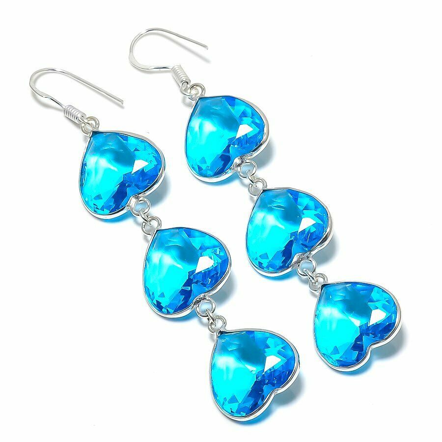 Χειροποίητα σκουλαρίκια, κατασκευασμένα από ασήμι 925 και διακοσμημένα με Swiss Blue Topaz σε κοπή heart. Total Carat Weight (TCW): 35.Τα σκουλαρίκια έχουν μήκος 7,6 εκατοστά.