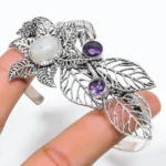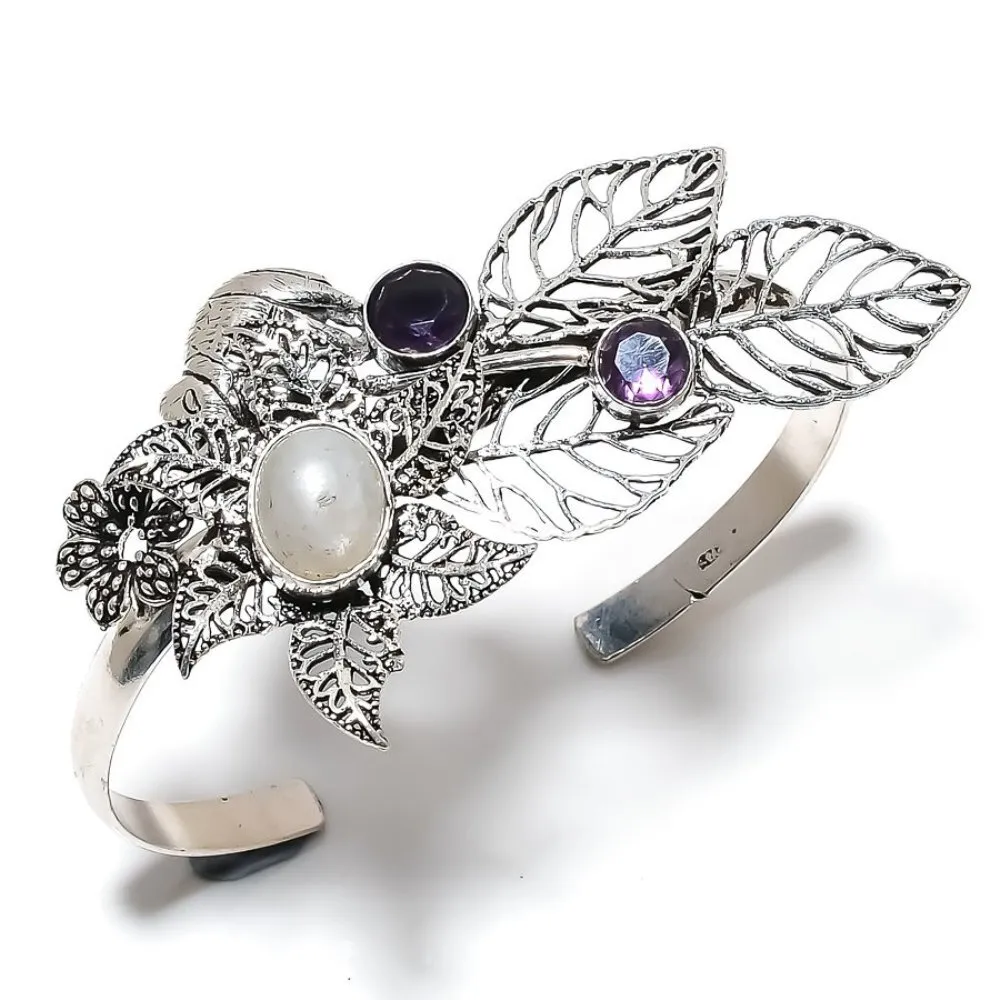 Χειροποίητο, ινδικό βραχιόλι κατασκευασμένο από ασήμι 925, διακοσμημένο με ορυκτούς λίθους  Φεγγαρόπετρας και Αμέθυστου σε κοπή round. Οpen Size για να προσαρμόζεται σε όλους τους καρπούς. Ένα πραγματικό αριστούργημα.