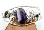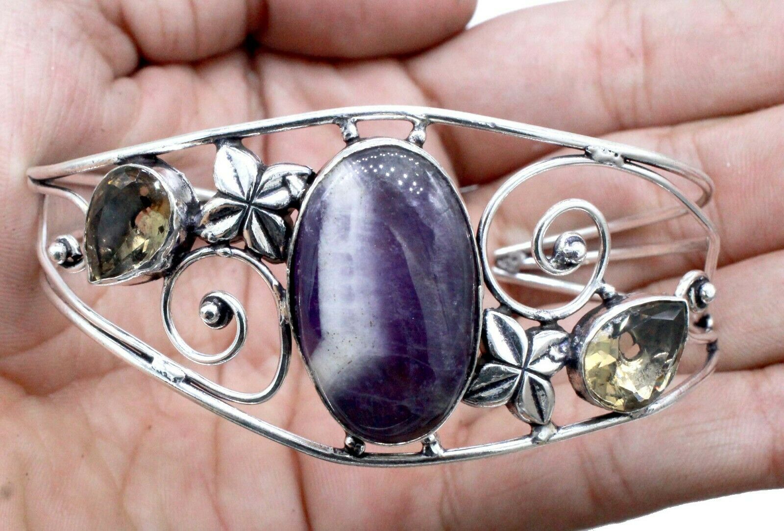 Χειροποίητο, ινδικό βραχιόλι κατασκευασμένο από ασήμι 925. Διακοσμημένο με φυσικό, ορυκτό αμέθυστο σε κοπή οβάλ και δύο μικρότερους καπνιά χαλαζία σε κοπή pear. Total Carat Weight (TCW): 120 CTS. Οpen Size για να προσαρμόζεται σε όλους τους καρπούς.