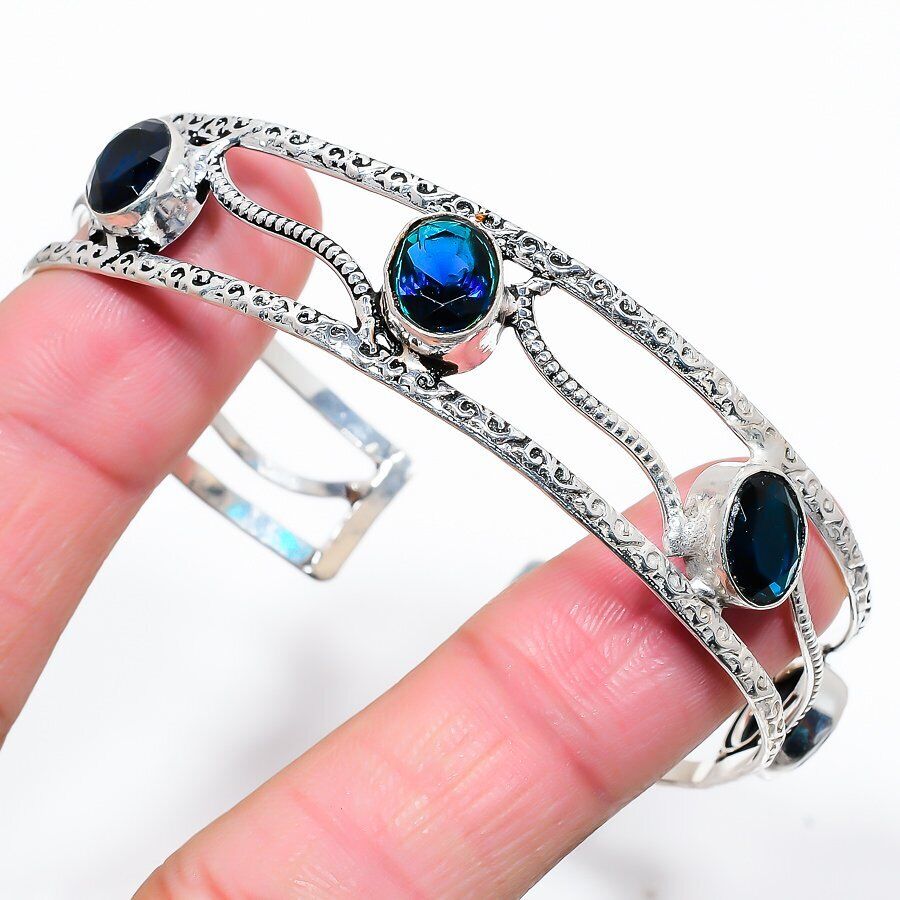 Χειροποίητο, ινδικό βραχιόλι κατασκευασμένο από ασήμι 925. Διακοσμημένο με ημιπολύτιμος ορυκτούς λίθους London Blue Topaz (Μπλε τοπάζι του Λονδίνου) εξαιρετικής καθαρότητας και λάμψης σε κοπή οβάλ. Οpen Size για να προσαρμόζεται σε όλους τους καρπούς. Ένα καταπληκτικό ασημένιο βραχιόλι που θα απογειώσει την εμφάνισή σου!!