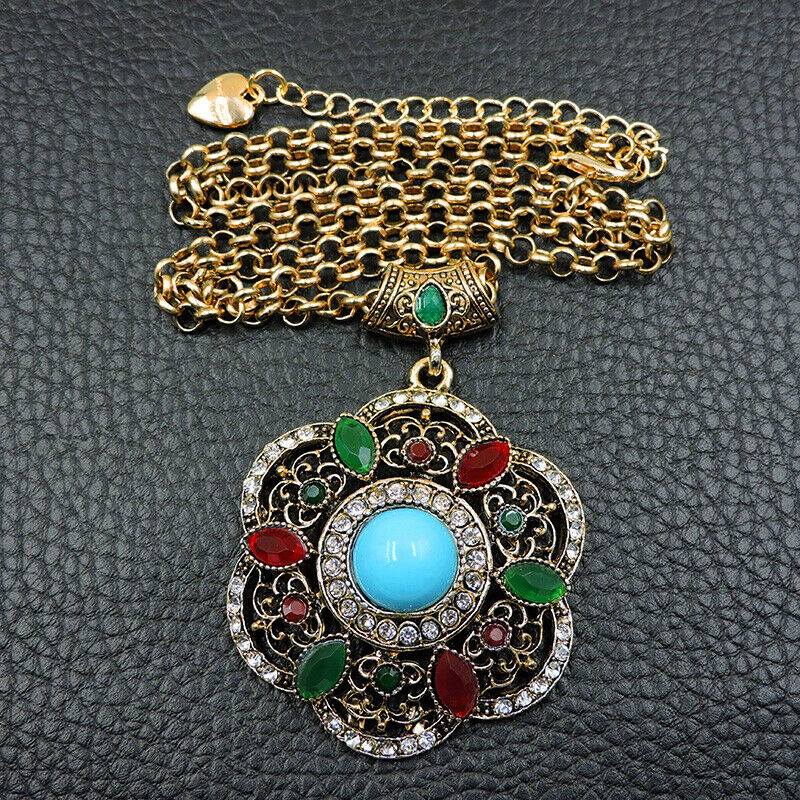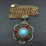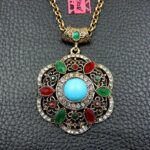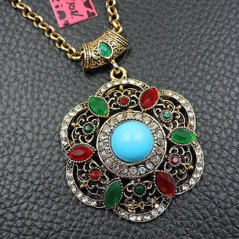 Ιδιαίτερο χειροποίητο κολιέ κατασκευασμένο από ασήμι και χαλκό με αντικέ επεξεργασία. Μεγάλο μοτίφ 5.5cmx5.5cm, το οποίο συνοδεύεται από την ανάλογη αλυσίδα 70 εκατοστών 5 εκατοστά το αλυσιδάκι προέκτασης στο πίσω μέρος, που καταλήγει σε μία καρδιά με το λογότυπο της σχεδιάστριας Betsey Johnson. Διακοσμημένο με ζιργκόν σε κοπή round και την κεντρική τυρκουάζ πέτρα από σμάλτο.