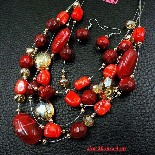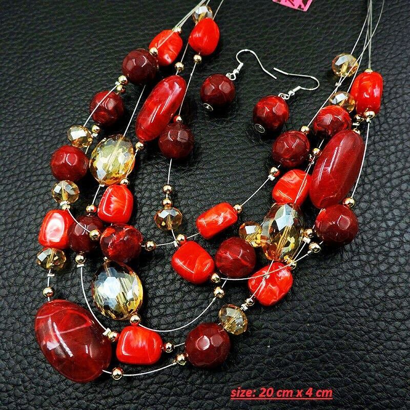 Υπέροχο σετ που αποτελείται από κολιέ 5 σειρών και σκουλαρίκια φιλοτεχνημένο από τη γνωστή σχεδιάστρια κοσμημάτων Βetsey Johnson, διακοσμημένο με κόκκινα και χρυσά κρύσταλλα στο χρώμα του ήλιου!