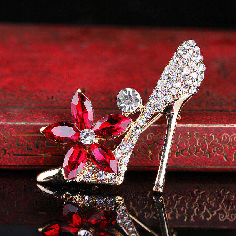 Γυναικεία καρφίτσα με μοτίφ μία ψηλοτάκουνη γόβα, κατασκευασμένη από ατσάλι με επιμετάλλωση κίτρινου χρυσού, διακοσμημένη με κρύσταλλα υψηλής ποιότητας σε χρώμα λευκό και κόκκινο