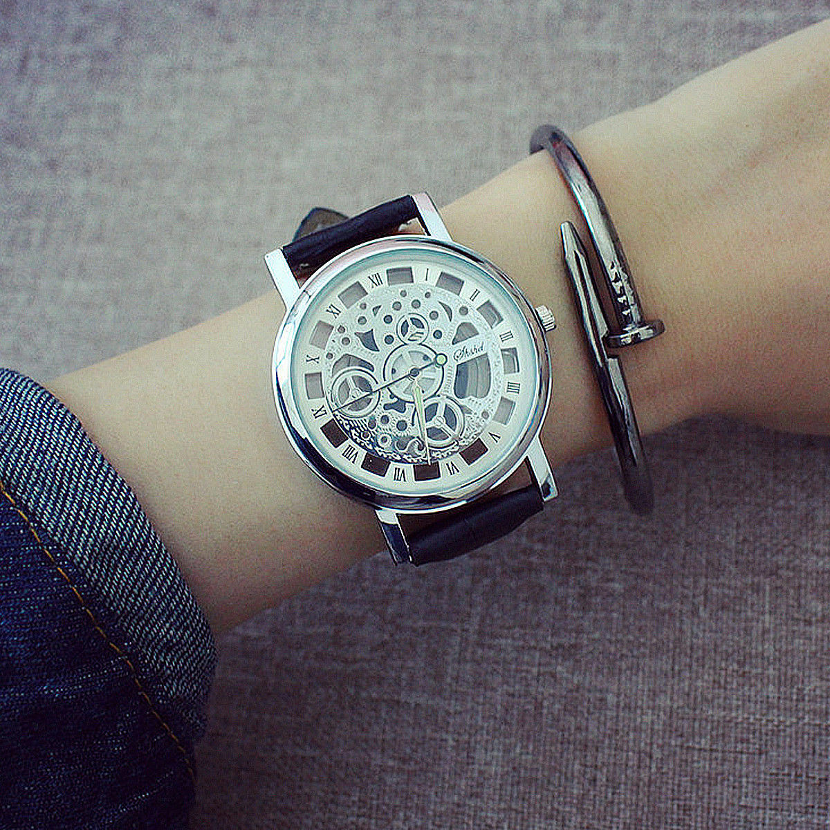 Ρολόι σε πολύ μοντέρνο σχέδιο με διαφανές ασημί καντράν και διαφανές το κάτω μέρος του καντράν έτσι ώστε να φαίνεται ο μηχανισμός του.Διαθέτει μαύρο λουράκι από δερματίνη. Διάμετρος καντράν 4 εκατοστά. Αδιάβροχο (πλύσιμο χεριών).