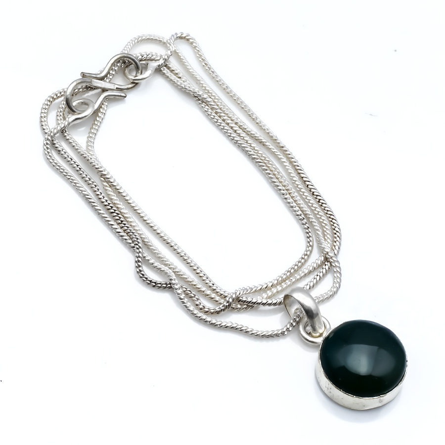Εντυπωσιακό μενταγιόν, κατασκευασμένο από ασήμι 925 διακοσμημένο με πολύτιμο ορυκτό όνυχα σε κοπή round ( πράσινο Όνυχας ) – στήριγμα για την αντιμετώπιση των προκλήσεων της ζωής). Συνοδεύεται από ασημένια αλυσίδα πάχους 2 χιλιοστών και μήκους 45 εκατοστών.