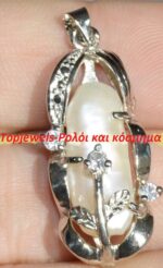 Ασημένιο μενταγιόν 925, διακοσμημένο με 100% μπαρόκ ΦΥΣΙΚΗ shell πέρλα (mother of pearl) γλυκού νερού 19mm και τρία (3) λευκά ζαφείρια (lab creation) σε κοπή round! Το μενταγιόν συνοδεύεται από την ασημένια αλυσίδα του μήκους 45cm.