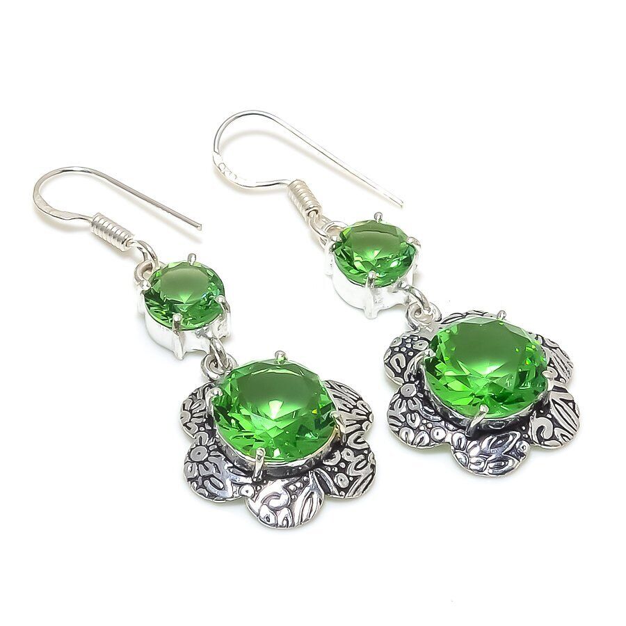 Χειροποίητα, σκουλαρίκια κατασκευασμένα από ασήμι 925 και φορούν ημιπολύτιμους λίθους. Διακοσμημένα με ορυκτούς  λίθους Tsavorite (τσαβοριτης) εξαιρετικής καθαρότητας και λάμψης, σε κοπή round. O Φυσικός Τσαβορίτης γρανάτης σε round κοπή από την Τανζανία με εξαιρετικό χρώμα και καθαρότητα! Tα σκουλαρίκια έχουν μήκος 5 εκατοστά.