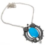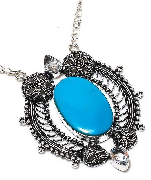 Σφυρήλατο, χειροποίητο γυναικείο κολιέ, κατασκευασμένο από ασήμι 925. Διακοσμημένο μεγάλο και εντυπωσιακό μοτίφ, ορυκτό τυρκουάζ Aριζόνας. Eπιπλέον διαθέτει 2 καθαρούς διάφανους ιολύτες σε κοπή pear. Το κολιέ διαθέτει αλυσίδα ασημένια 925 μήκους 92 cm. Οι ορυκτές πέτρες είναι συναρπαστικές και μοναδικές.