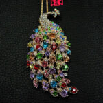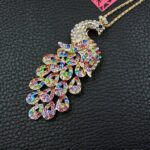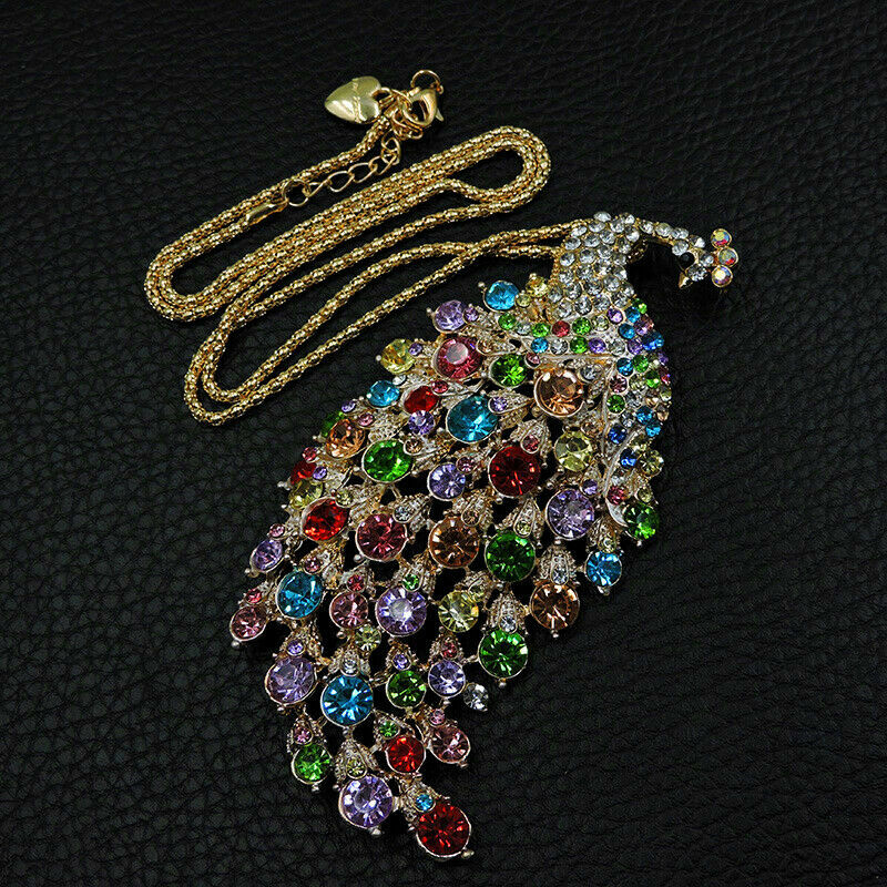 | Ένα πραγματικό αριστούργημα, ένα μενταγιόν υπερπαραγωγή, σχεδιασμένο από την betsey Johnson με ένα τεράστιο παγόνι 11 εκατοστά X 6 εκατοστά, διακοσμημένο με πολύχρωμα αυστραλιανά κρύσταλλα. Συνοδεύεται από επίχρυση αλυσίδα 70 εκατοστών διαμέτρου 4m.