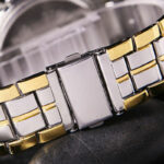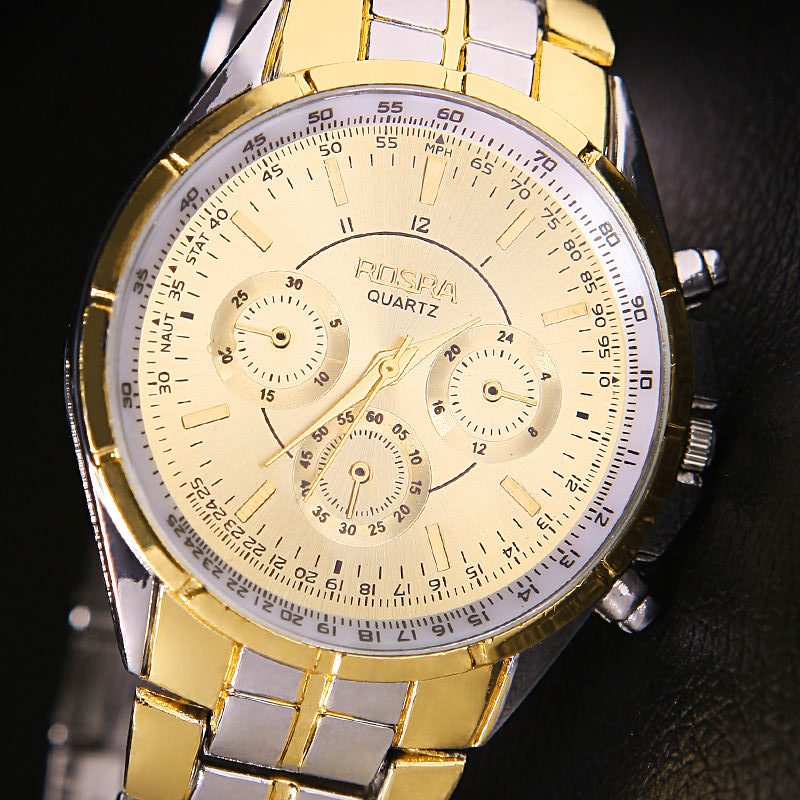 Αναλογικό, πολυτελείας, ανοξείδωτο ατσάλι το καντράν, σε χρώμα gold-silver το μπρασελέ, χρυσό καντράν με μαύρες αποχρώσεις, 4,4 εκ. διάμετρος, όχι αδιάβροχο.