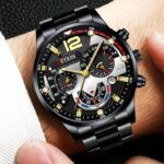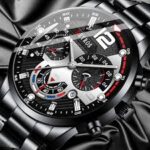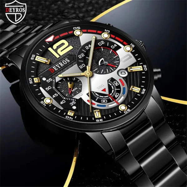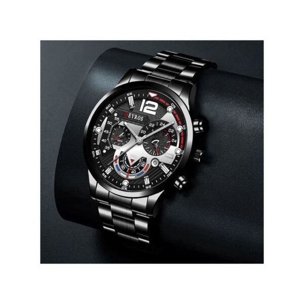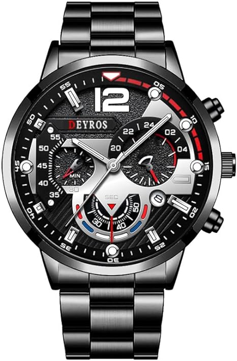 Ανδρικό, αναλογικό ρολόι πολυτελείας, μαύρο καντράν με silver λεπτομέρειες και silver δείκτες λεπτών και ώρας, ενώ διαθέτει και ένδειξη ημερομηνίας. Ο εσωτερικός του σχεδιασμός του προσδίδει μια εξαιρετική φινέτσα. Το μπρασελέ σε χρώμα black από ανοξείδωτο ατσάλι. Διάμετρος καντράν 4,4 εκατοστά. Μήκος μπρασελέ περίπου 25 εκατοστά. Είναι αντιαλλεργικό σύμφωνα με τις απαιτήσεις της Ευρωπαικής Ένωσης.
