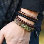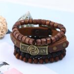 Ανδρικό vintage βραχιόλι κατασκευασμένο μόνο από φυσικά υλικά, δέρμα αγελάδας και ξύλο, προσαρμόζεται σε όλα τα μεγέθη. Αποτελείται από τέσσερα ξεχωριστά βραχιόλια.