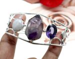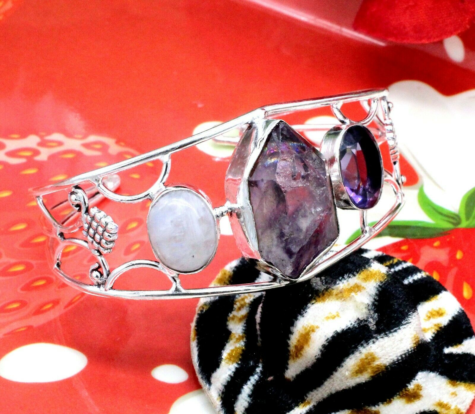 Χειροποίητο, ινδικό βραχιόλι κατασκευασμένο από ασήμι 925, διακοσμημένο με ορυκτό, φυσικό, ακατέργαστο αμέθυστο και φεγγαρόπετρα (Amethyst & Moonstone). Ένα πραγματικό αριστούργημα. Open Size έτσι ώστε να προσαρμόζεται σε όλους τους καρπούς.