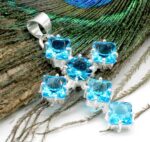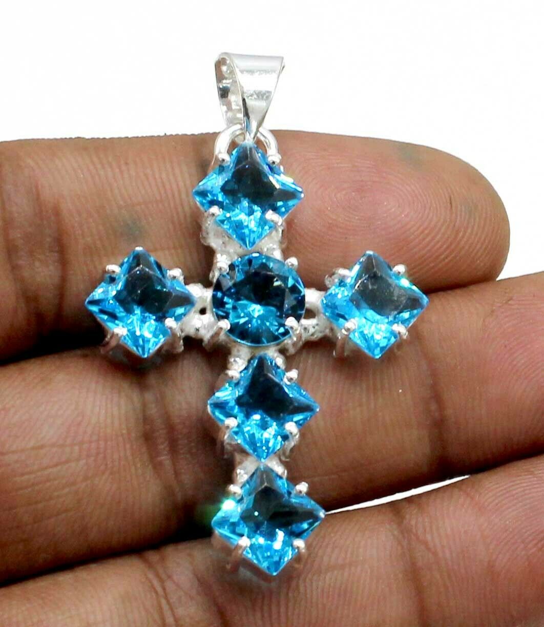 Iνδικός, χειροποίητος γυναικείος σταυρός, κατασκευασμένος από μασίφ ασήμι 925. Διακοσμημένος με υπέροχες, λαμπερές πέτρες μπλε τοπάζι ( Swiss Blue Topaz) (Lab creation) διαστάσεων 4 χ 3 εκατοστά. Τιμή 52 ευρώ