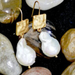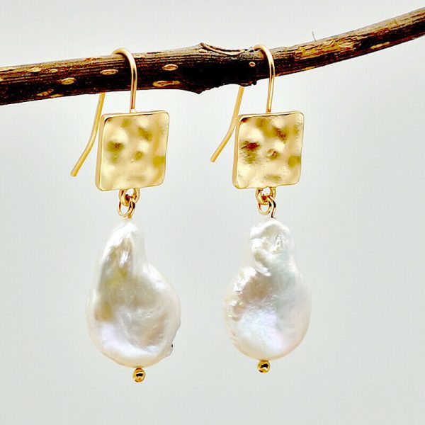 Σκουλαρίκια κρεμαστά 5 cm με επιμετάλλωση χρυσού 18k σφυρήλατο. Διακοσμημένα με απομίμηση μαργαριταριού, μεγέθους 14-16 mm.