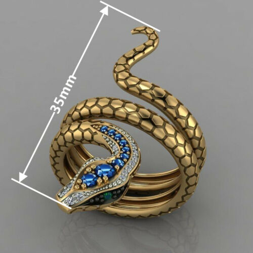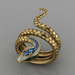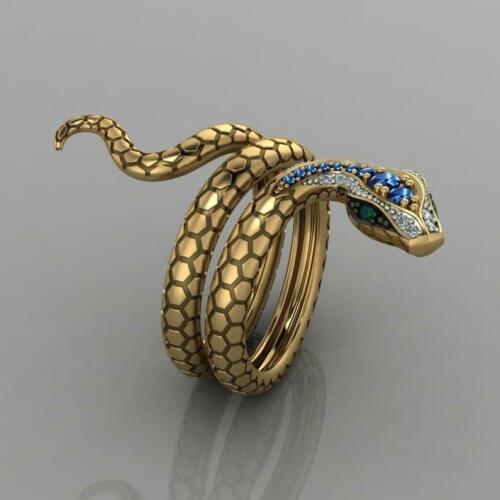 Γυναικείο δαχτυλίδι φίδι, κατασκευασμένο από ασήμι και χαλκό με επιμετάλλωση κίτρινου χρυσού 14 καράτια. Διακοσμημένο με λευκά ζιρκόνια σε κοπή round και μπλε τεχνητά ζαφείρια σε κοπή round.